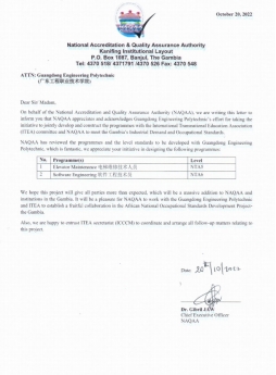 2022年10月21日,我校申報“非洲國家職業(yè)標準開發(fā)項目——岡比亞”的兩個職業(yè)標準已經(jīng)獲得岡比亞國家認證與質(zhì)量保證局(NAQAA)的同意,學(xué)校獲批為“電梯維修技術(shù)人員(NTA5)”和“軟件工程技術(shù)員(NTA6)”的獨立建設(shè)單位,這是學(xué)校在全面建設(shè)高水平高等職業(yè)院校,提升國際化水平方面的又一重要成果。