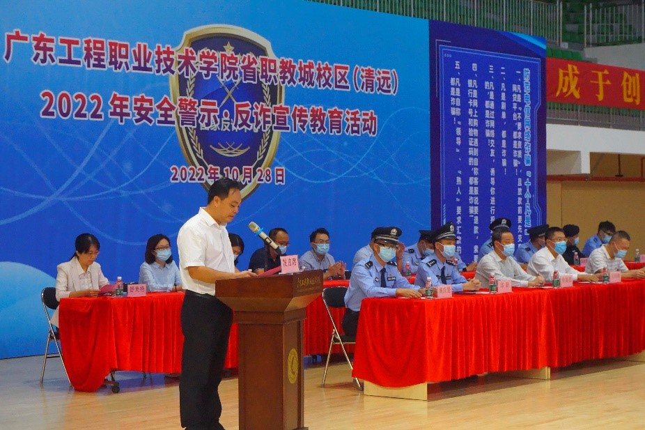 2022年10月28日上午,為深入貫徹落實(shí)習(xí)近平總書記關(guān)于統(tǒng)籌發(fā)展與安全、關(guān)于打擊治理電信網(wǎng)絡(luò)詐騙犯罪工作的重要指示精神,對(duì)標(biāo)對(duì)表省公安廳、省教育廳、屬地單位的校園安全工作部署,切實(shí)將打擊治理電信詐騙向縱深推進(jìn),提升學(xué)校安全工作能力,筑牢學(xué)校安全防線,學(xué)校在省職教城校區(qū)(清遠(yuǎn))舉辦了2022年安全警示反詐宣傳教育活動(dòng)。