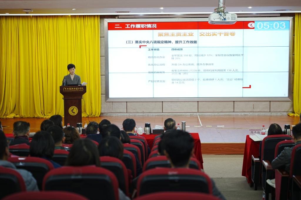 1月4日,學(xué)校在廣州校區(qū)圖書館報(bào)告廳召開2025年度學(xué)校中層干部述職述廉評議考核會議。全體學(xué)校領(lǐng)導(dǎo)、中層干部參加會議。黨委副書記陳冬梅主持會議。