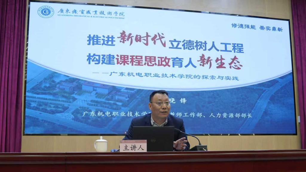 下午的培訓圍繞“課程思政”體系化建設展開。廣東機電職業(yè)技術學院行政教輔黨總支書記、黨委教師工作部部長蘇曉鋒以《推進新時代立德樹人工程 構建課程思政育人新生態(tài)》為題,分享了構建“大思政”格局的實踐經(jīng)驗,重點介紹了該校在教師隊伍建設、評價改革與思政育人能力提升協(xié)同推進方面的創(chuàng)新舉措。隨后,廣東機電職業(yè)技術學院設計學院副院長蔡曉紅教授以《夯實設計基礎,助力職業(yè)啟航——以〈色彩設計〉課程思政建設為例》為題,展示了如何在專業(yè)課程中自然融入價值引領,實現(xiàn)知識傳授、能力培養(yǎng)與價值塑造的有機統(tǒng)一?,F(xiàn)代物流管理專業(yè)帶頭人殷華副教授則以《思政有機融入專業(yè)課程——職業(yè)教育課程思政建設探索與實踐分享》為題,分享了物流專業(yè)課程思政示范課的建設路徑與教學改革心得。專家們的分享案例具體、方法實用,為一線教師開展課程思政建設提供了可操作的范本。