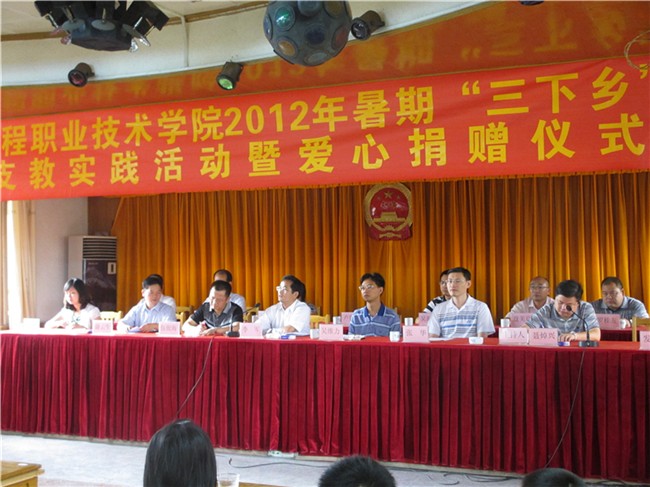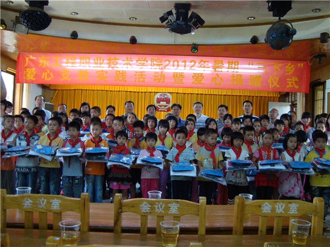 2012年7月11日上午,廣東工程職業(yè)技術學院2012年暑期"三下鄉(xiāng)"愛心支教實踐活動暨愛心捐贈儀式在云安縣南盛鎮(zhèn)政府2樓會議室舉行。出席儀式的有:學院黨委李軍副書記、云安縣委吳維力副書記、云安縣委組織部部長伍俊海、學院學生工作部部長張華、學院團委書記黃馥麗、財經系黨總支副書記吳海彬、團云安縣委書記聶焯興、南盛鎮(zhèn)鎮(zhèn)委書記謝云生,出席儀式的還有南盛鎮(zhèn)中心小學校長、橫崗小學校長、我院36名參加支教的老師、學生,南盛鎮(zhèn)60名留守兒童等。
