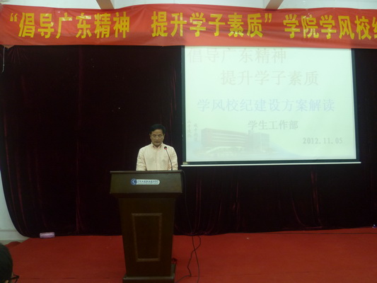 為踐行"厚于德、誠于信、敏于行"的新時(shí)期廣東精神,加強(qiáng)學(xué)生管理,強(qiáng)化學(xué)風(fēng)建設(shè),優(yōu)化育人環(huán)境,提高人才培養(yǎng)質(zhì)量,11月5日中午,"倡導(dǎo)廣東精神 提升學(xué)子素質(zhì)"學(xué)風(fēng)校紀(jì)建設(shè)活動(dòng)啟動(dòng)儀式在學(xué)院教學(xué)樓102教室舉行。學(xué)院黨委李軍副書記、各系(院)黨總支書記、政治輔導(dǎo)員及二百余名學(xué)生干部代表參加了此次啟動(dòng)儀式,啟動(dòng)儀式由學(xué)生工作部張華部長主持。