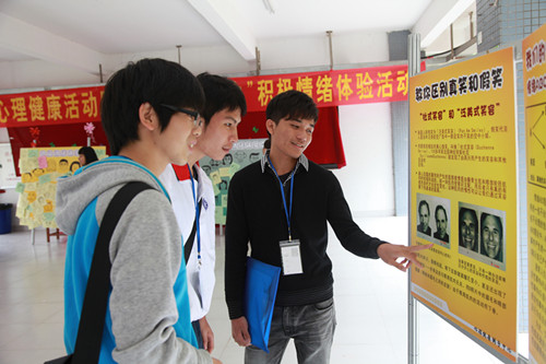 學(xué)生在心理知識(shí)海報(bào)宣傳區(qū)學(xué)習(xí)交流