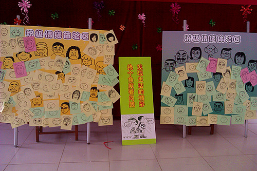 學(xué)生將開心臉譜粘貼在情緒展示板
