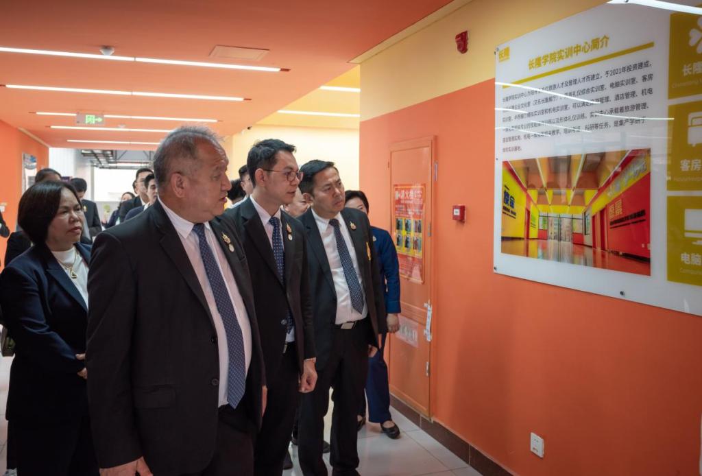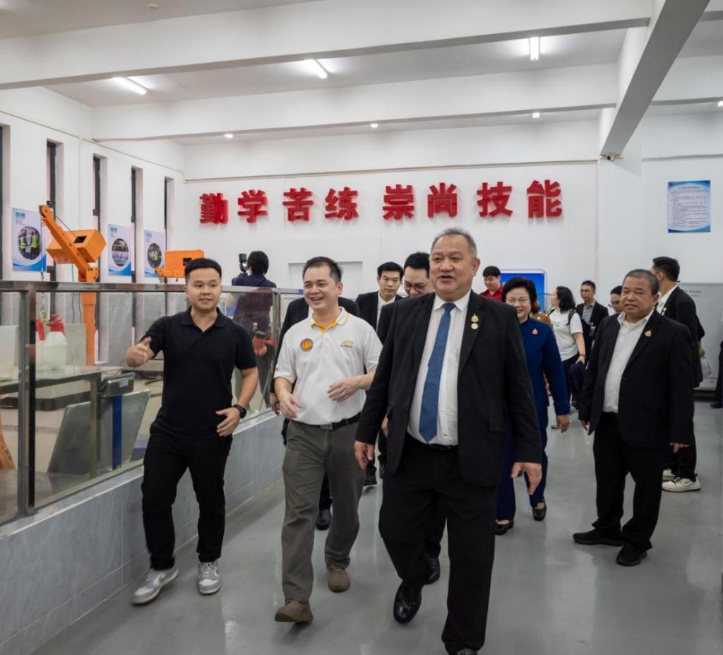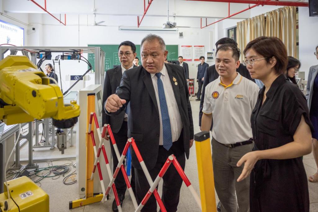 李麗校長代表學(xué)校對尤薩蓬·韋努科塞秘書長一行的到來表示歡迎,她重點(diǎn)介紹了學(xué)校在產(chǎn)教融合、校企合作方面的實(shí)踐經(jīng)驗(yàn),并陪同來賓參觀了學(xué)校羅克韋爾智能制造協(xié)同創(chuàng)新中心、長隆產(chǎn)業(yè)學(xué)院、迅達(dá)電梯產(chǎn)業(yè)學(xué)院、建筑工程技術(shù)實(shí)訓(xùn)基地等。尤薩蓬·韋努科塞秘書長對學(xué)校的熱情接待表示感謝,對學(xué)校產(chǎn)教融合的職教理念表示欽佩。代表團(tuán)對學(xué)校實(shí)訓(xùn)實(shí)踐布局、校企合作模式及技術(shù)應(yīng)用成果表現(xiàn)出濃厚興趣。