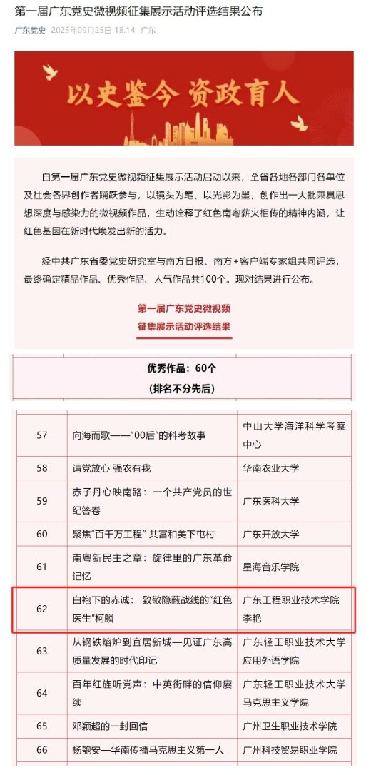 近日,第一屆廣東黨史微視頻征集展示活動評選結(jié)果正式揭曉,我校馬克思主義學(xué)院教師李艷創(chuàng)作的微視頻《白袍下的赤誠:致敬隱蔽戰(zhàn)線的“紅色醫(yī)生”柯麟》榮獲“優(yōu)秀作品”獎。該作品以我校首任校長柯麟同志的光輝事跡為藍(lán)本,展現(xiàn)出了柯麟同志堅定的理想信念、無私奉獻(xiàn)的精神和高尚的醫(yī)德。