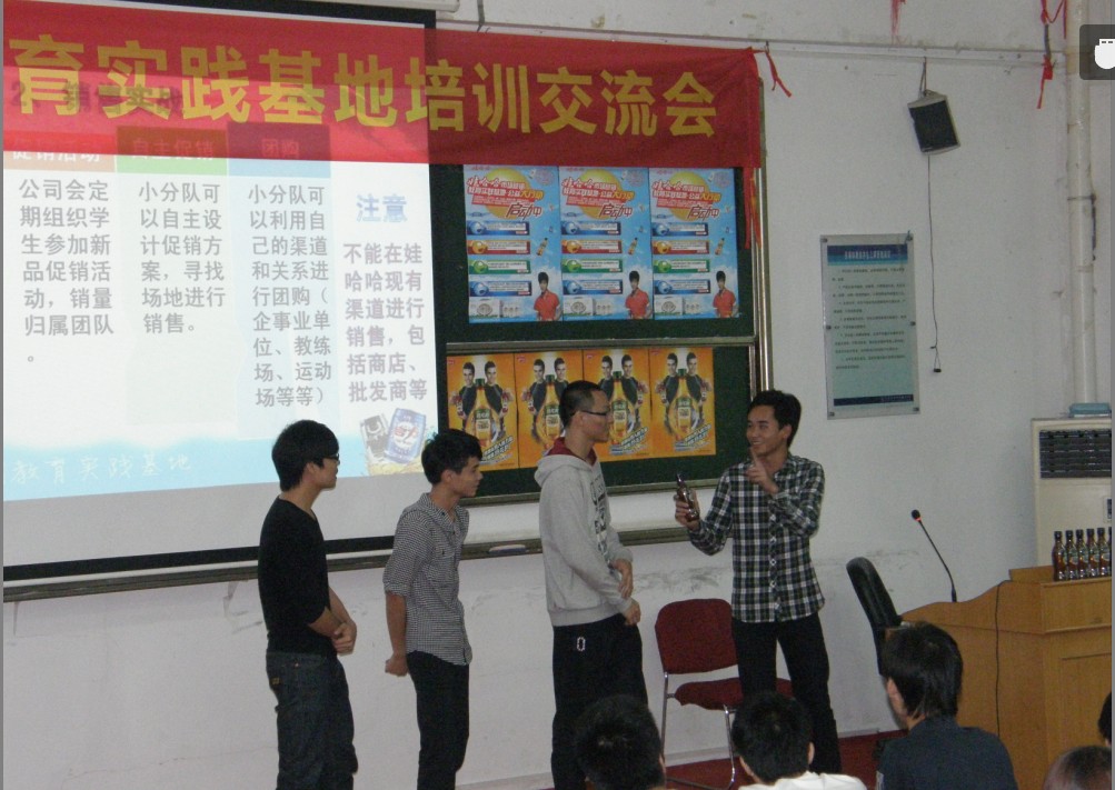 許經(jīng)理對娃哈哈集團和整個活動進行了簡要的介紹,并通過與參賽者的互動游戲,培訓(xùn)學(xué)生如何開展?fàn)I銷活動以及要注意的事項。同時,還讓參賽者品嘗了公司的新產(chǎn)品。通過此次培訓(xùn),各系參賽者對比賽有了更充分的了解,對贏得優(yōu)勝充滿了信心。