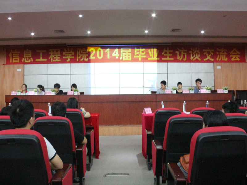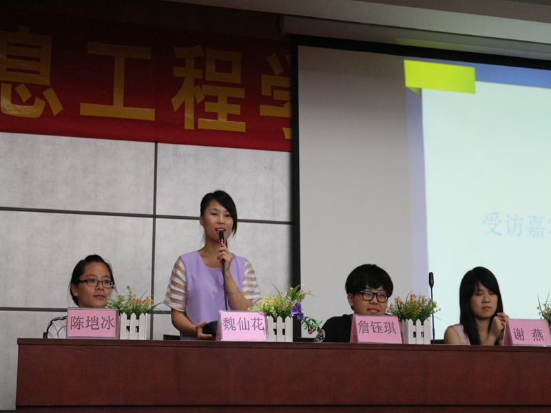 為促進在校生與畢業(yè)生之間交流,幫助其合理規(guī)劃大學生活,提升就業(yè)觀念,2014年6月13日晚上七點半,信息工程學院2014屆畢業(yè)生訪談會在圖書館一樓學術報告廳隆重舉行。本次訪談會邀請了國家獎學金代表陳塏冰、優(yōu)秀畢業(yè)生代表鐘佩倫、優(yōu)秀學生干部代表謝燕、考上廣州美術學院優(yōu)秀學生代表詹鈺琪、優(yōu)秀實習生代表魏仙花、黨員代表曾春露等人作為訪談嘉賓,信息工程學院劉松梅書記、肖貴燈副書記、李碧方老師、劉娟老師、葉曉明老師及我院12、13級學生出席了本次訪談會。