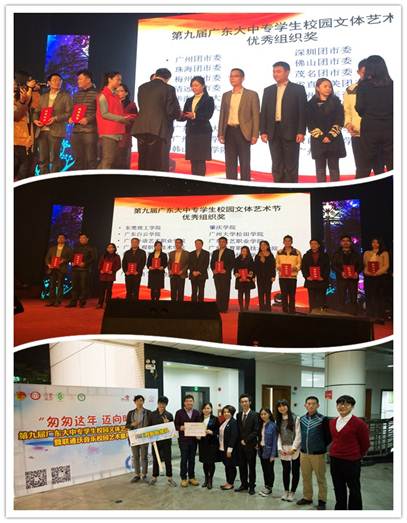 12月25日,由團(tuán)省委、省教育廳、省文化廳、省體育局、省學(xué)聯(lián)共同舉辦的廣東省第九屆大學(xué)生文體藝術(shù)節(jié)閉幕式晚會(huì)在廣州中醫(yī)藥大學(xué)(大學(xué)城校區(qū))隆重舉行。共青團(tuán)廣東省委書記曾穎如等領(lǐng)導(dǎo)出席并為獲獎(jiǎng)單位頒發(fā)"校園文化藝術(shù)品牌項(xiàng)目、校園體育運(yùn)動(dòng)品牌項(xiàng)目進(jìn)行頒獎(jiǎng)"、"優(yōu)秀組織獎(jiǎng)"。我校更首次獲得廣東大中專學(xué)生校園文體藝術(shù)節(jié)"優(yōu)秀組織獎(jiǎng)"。我校團(tuán)委書記黃馥麗老師、李冠文老師作為獲獎(jiǎng)單位代表應(yīng)邀出席活動(dòng)。