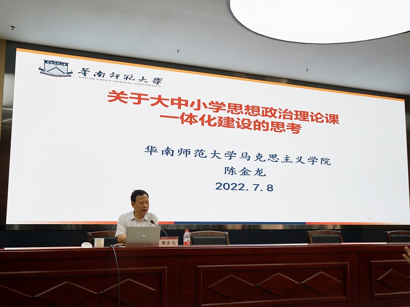 在專題研討環(huán)節(jié),一體化建設(shè)專家指導(dǎo)組組長華南師范大學(xué)陳金龍教授做了題為《關(guān)于大中小學(xué)思想政治理論課一體化建設(shè)的思考》主旨報告,他認(rèn)為:“推進(jìn)大中小學(xué)思政課一體化建設(shè)要遵循學(xué)生認(rèn)知、成長規(guī)律,教育教學(xué)規(guī)律和回應(yīng)時代發(fā)展與社會進(jìn)步的必然要求;要把整體設(shè)計教學(xué)目標(biāo)、統(tǒng)籌優(yōu)化教學(xué)內(nèi)容、科學(xué)規(guī)劃教材建設(shè)、合理統(tǒng)籌教學(xué)評價、建齊配強(qiáng)教師隊伍、立體推進(jìn)交流互動作為推進(jìn)大中小學(xué)思政課一體化建設(shè)重點。”