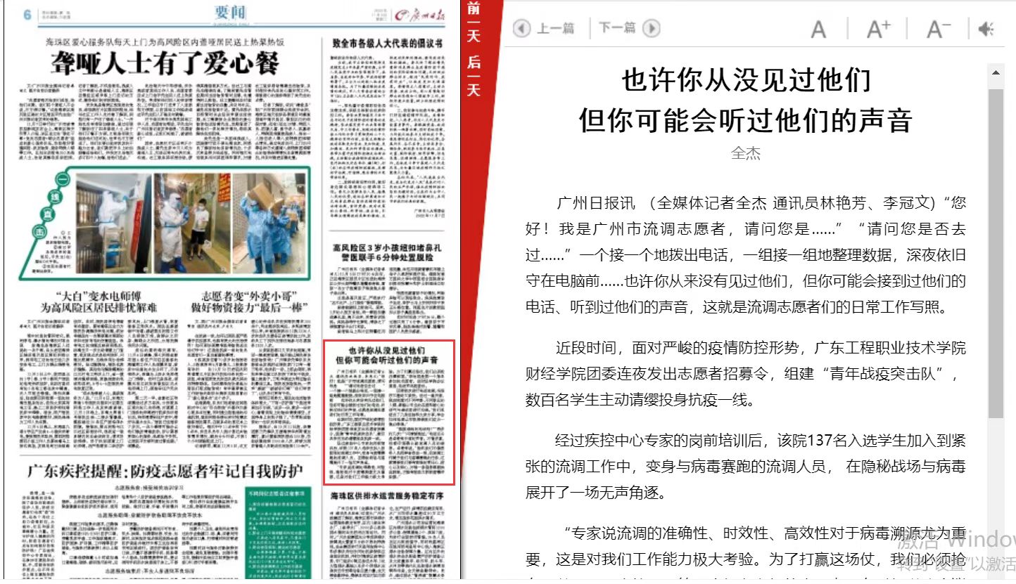 廣州日?qǐng)?bào)的報(bào)道中寫(xiě)道:“也許你從未見(jiàn)過(guò)面,但可能聽(tīng)過(guò)他們的聲音,志愿者們與病毒賽跑,和疫情搶時(shí)間,克服了各種困難,為早一步完成流調(diào)就能早一步抑制病毒傳播的風(fēng)險(xiǎn)而努力,贊揚(yáng)財(cái)經(jīng)學(xué)院志愿者以實(shí)際行動(dòng)彰顯新時(shí)代大學(xué)生的精神風(fēng)貌。”