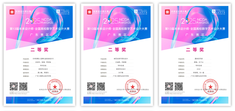 近日,2025 第 13 屆未來設(shè)計師·全國高校數(shù)字藝術(shù)設(shè)計大賽(NCDA)全國總決賽獲獎結(jié)果公布,我校師生在大賽中再創(chuàng)佳績,共獲21項獎項,其中國賽獎項4項(包括一等獎1項、二等獎2項、三等獎1項),省賽獎項17項(一等獎6項、二等獎7項、三等獎4項),廣東工程職業(yè)技術(shù)學(xué)院獲廣東賽區(qū)優(yōu)秀組織獎。