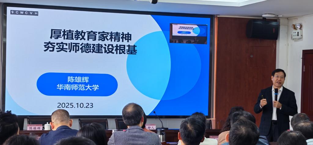 陳雄輝研究員以《厚植教育家精神 夯實(shí)師德建設(shè)根基》為題,從弘揚(yáng)教育家精神、夯實(shí)師德建設(shè)根基、培養(yǎng)創(chuàng)新人才和案例分析等三個(gè)方面做了精彩的講座,并通過新時(shí)代高校教師職業(yè)行為十項(xiàng)準(zhǔn)則的解讀、違反準(zhǔn)則的警示案例、為人師表關(guān)愛學(xué)生成長案例,提出了夯實(shí)師德建設(shè)根基、踐行育人責(zé)任、做好引路人的建議,為學(xué)校開展師德師風(fēng)工作提供了豐富的經(jīng)驗(yàn),對(duì)學(xué)校教職工弘揚(yáng)教育家精神、爭做“四有”好老師提供了深刻啟迪。