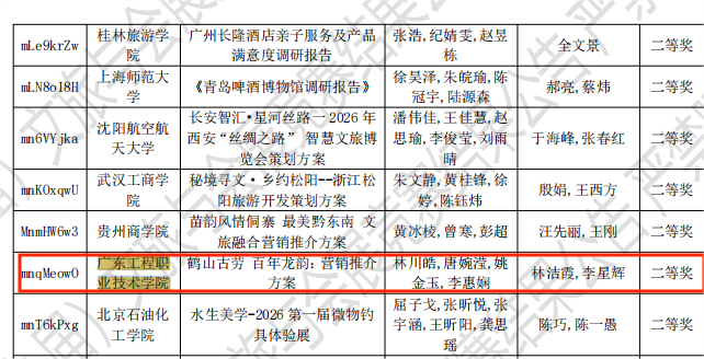 近日,2026年(新加坡)國(guó)際商務(wù)會(huì)展策劃大賽中國(guó)地區(qū)選拔賽暨第十九屆全國(guó)高校商業(yè)精英挑戰(zhàn)賽文旅與會(huì)展創(chuàng)新創(chuàng)業(yè)實(shí)踐競(jìng)賽全國(guó)總決賽圓滿(mǎn)落幕。我校文化旅游學(xué)院會(huì)展策劃與管理專(zhuān)業(yè)選派的三支參賽團(tuán)隊(duì)表現(xiàn)優(yōu)異,共榮獲全國(guó)二等獎(jiǎng)兩項(xiàng)、三等獎(jiǎng)一項(xiàng),充分展現(xiàn)了我校在會(huì)展教育及人才培養(yǎng)方面的扎實(shí)基礎(chǔ)和成效。