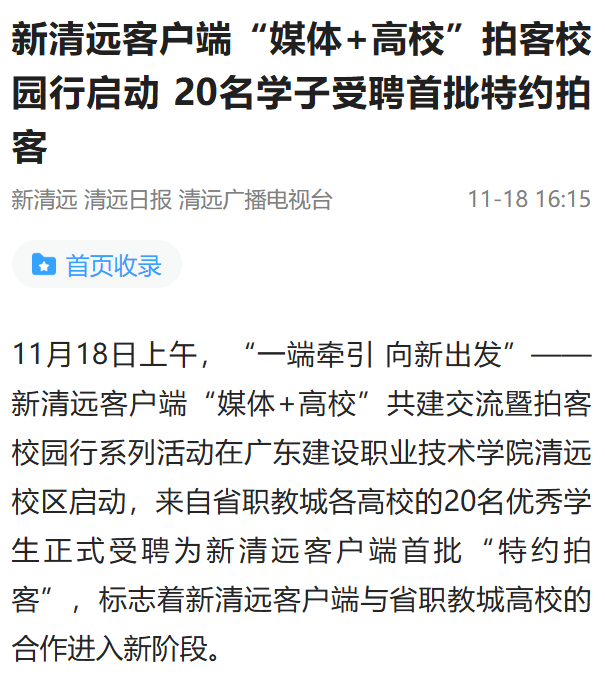 廣東建設(shè)職業(yè)技術(shù)學(xué)院黨委副書(shū)記方秀英表示,“媒體+高校”的合作模式必將為高校人才培養(yǎng)注入新的活力,為地方媒體發(fā)展提供新的動(dòng)能,更為清遠(yuǎn)城市形象傳播開(kāi)辟新的路徑。學(xué)校將進(jìn)一步深化與新清遠(yuǎn)客戶端的戰(zhàn)略合作,包括共建人才培養(yǎng)平臺(tái)、共筑內(nèi)容創(chuàng)作高地、共促品牌影響力提升等,鼓勵(lì)師生運(yùn)用新媒體平臺(tái)展示校園風(fēng)采、傳播職教聲音、講述清遠(yuǎn)故事。