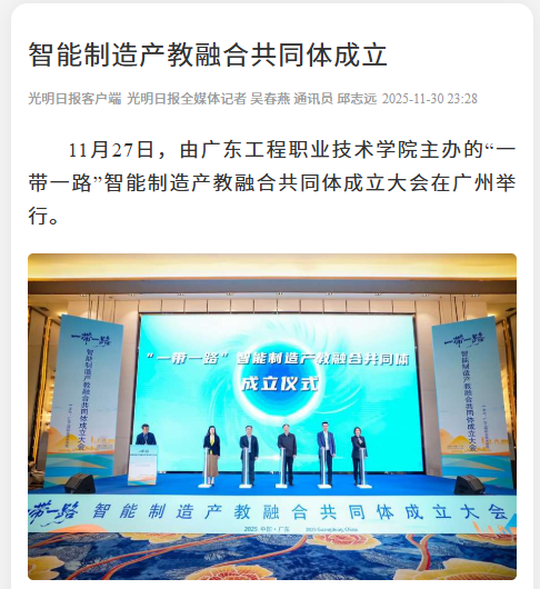 11月27日,由廣東工程職業(yè)技術(shù)學(xué)院主辦的“一帶一路”智能制造產(chǎn)教融合共同體成立大會在廣州舉行。