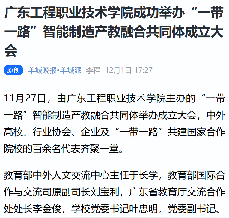 11月27日,由廣東工程職業(yè)技術學院主辦的“一帶一路”智能制造產(chǎn)教融合共同體舉辦成立大會,中外高校、行業(yè)協(xié)會、企業(yè)及“一帶一路”共建國家合作院校的百余名代表齊聚一堂。