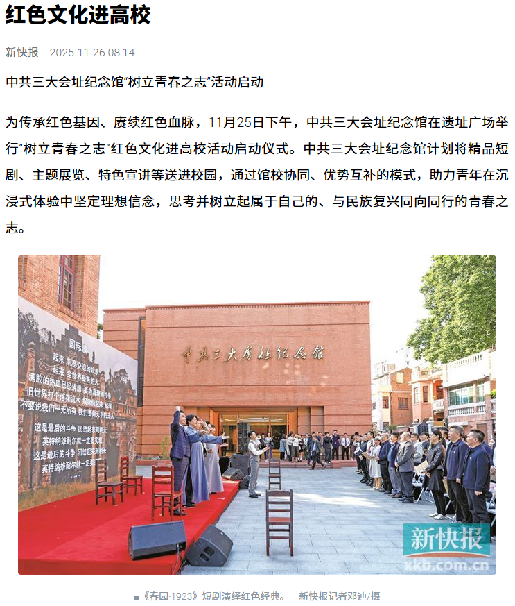 為傳承紅色基因、賡續(xù)紅色血脈,11月25日下午,中共三大會址紀(jì)念館在遺址廣場舉行“樹立青春之志”紅色文化進(jìn)高校活動啟動儀式。中共三大會址紀(jì)念館計(jì)劃將精品短劇、主題展覽、特色宣講等送進(jìn)校園,通過館校協(xié)同、優(yōu)勢互補(bǔ)的模式,助力青年在沉浸式體驗(yàn)中堅(jiān)定理想信念,思考并樹立起屬于自己的、與民族復(fù)興同向同行的青春之志。