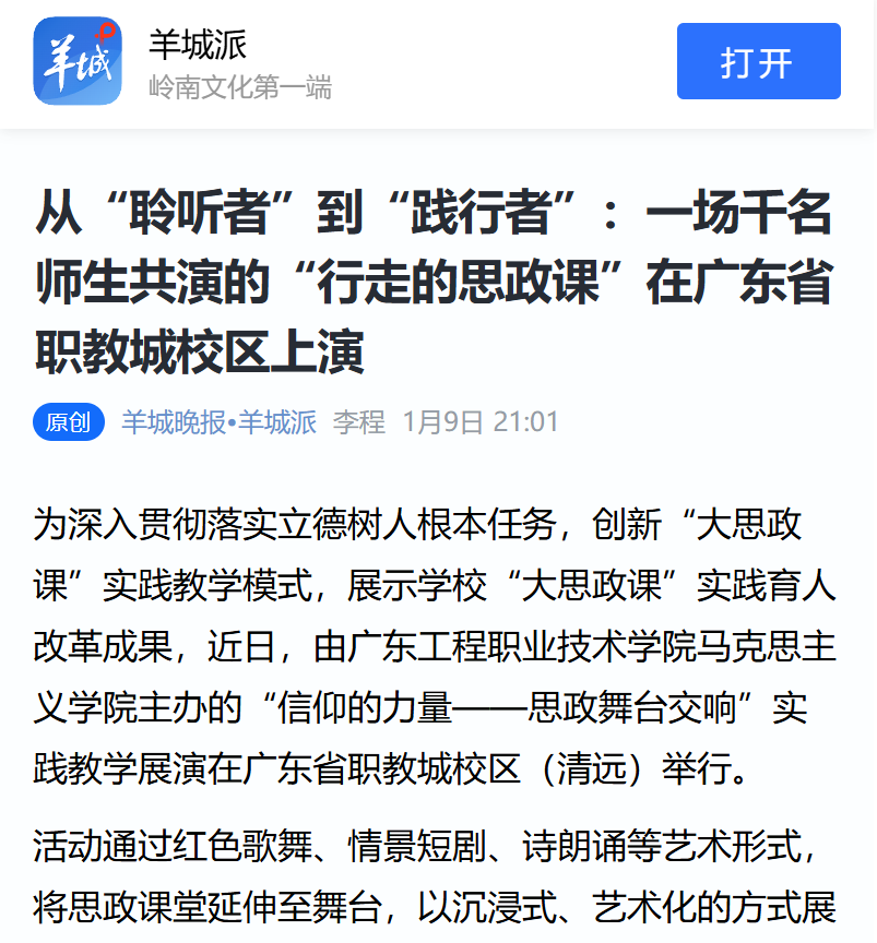 為深入貫徹落實立德樹人根本任務,創(chuàng)新“大思政課”實踐教學模式,展示學校“大思政課”實踐育人改革成果,近日,由廣東工程職業(yè)技術學院馬克思主義學院主辦的“信仰的力量——思政舞臺交響”實踐教學展演在廣東省職教城校區(qū)(清遠)舉行。