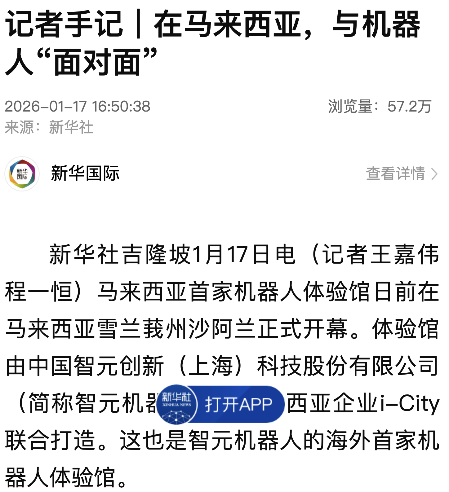 新華社吉隆坡1月17日電(記者王嘉偉 程一恒)馬來西亞首家機器人體驗館日前在馬來西亞雪蘭莪州沙阿蘭正式開幕。體驗館由中國智元創(chuàng)新(上海)科技股份有限公司(簡稱智元機器人)與馬來西亞企業(yè)i-City聯(lián)合打造。這也是智元機器人的海外首家機器人體驗館。