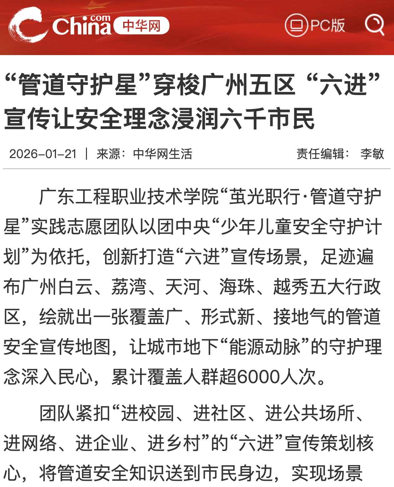 廣東工程職業(yè)技術(shù)學(xué)院“繭光職行·管道守護(hù)星”實(shí)踐志愿團(tuán)隊(duì)以團(tuán)中央“少年兒童安全守護(hù)計(jì)劃”為依托,創(chuàng)新打造“六進(jìn)”宣傳場(chǎng)景,足跡遍布廣州白云、荔灣、天河、海珠、越秀五大行政區(qū),繪就出一張覆蓋廣、形式新、接地氣的管道安全宣傳地圖,讓城市地下“能源動(dòng)脈”的守護(hù)理念深入民心,累計(jì)覆蓋人群超6000人次。