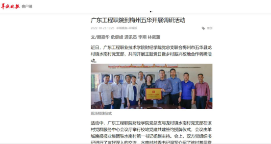 今年暑假,我院11名師生組成的“德誠(chéng)才精”暑假三下鄉(xiāng)社會(huì)實(shí)踐隊(duì)來(lái)到梅州市五華縣龍村鎮(zhèn)水南村,開(kāi)展為期6天的鄉(xiāng)村振興暑假大學(xué)生社會(huì)實(shí)踐服務(wù)活動(dòng),通過(guò)調(diào)研、直播助農(nóng)、支教、慰問(wèn)、座談等形式助力鄉(xiāng)村振興。暑假“三下鄉(xiāng)”社會(huì)實(shí)踐活動(dòng)與水南村達(dá)成了良好的合作效果,也奠定了下一步的合作意向。10月13-14日,財(cái)經(jīng)學(xué)院黨總支聯(lián)合梅州市五華縣龍村鎮(zhèn)水南村黨支部,共同開(kāi)展“喜迎黨的二十大·結(jié)對(duì)共譜鄉(xiāng)村振興新篇章”主題黨日暨鄉(xiāng)村振興校地合作調(diào)研活動(dòng),該活動(dòng)獲得《羊城晚報(bào)》報(bào)道。