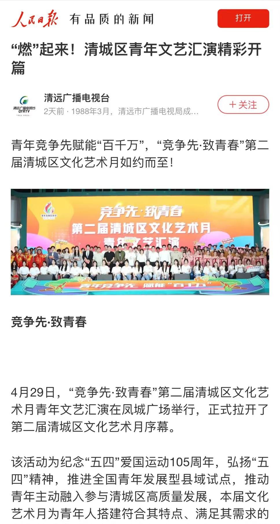 4月29日,“競爭先·致青春”第二屆清城區(qū)文化藝術(shù)月青年文藝匯演在鳳城廣場舉行,正式拉開了第二屆清城區(qū)文化藝術(shù)月序幕。