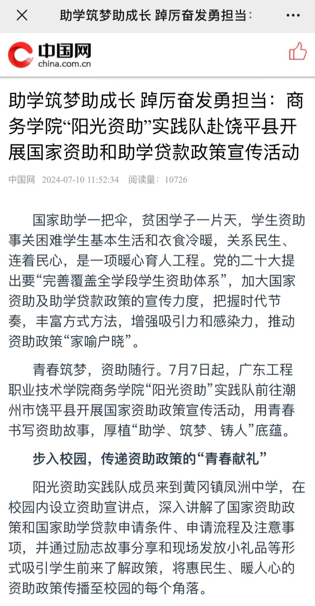 青春筑夢,資助隨行。7月7日起,廣東工程職業(yè)技術(shù)學(xué)院商務(wù)學(xué)院“陽光資助”實(shí)踐隊(duì)前往潮州市饒平縣開展國家資助政策宣傳活動,用青春書寫資助故事,厚植“助學(xué)、筑夢、鑄人”底蘊(yùn)。