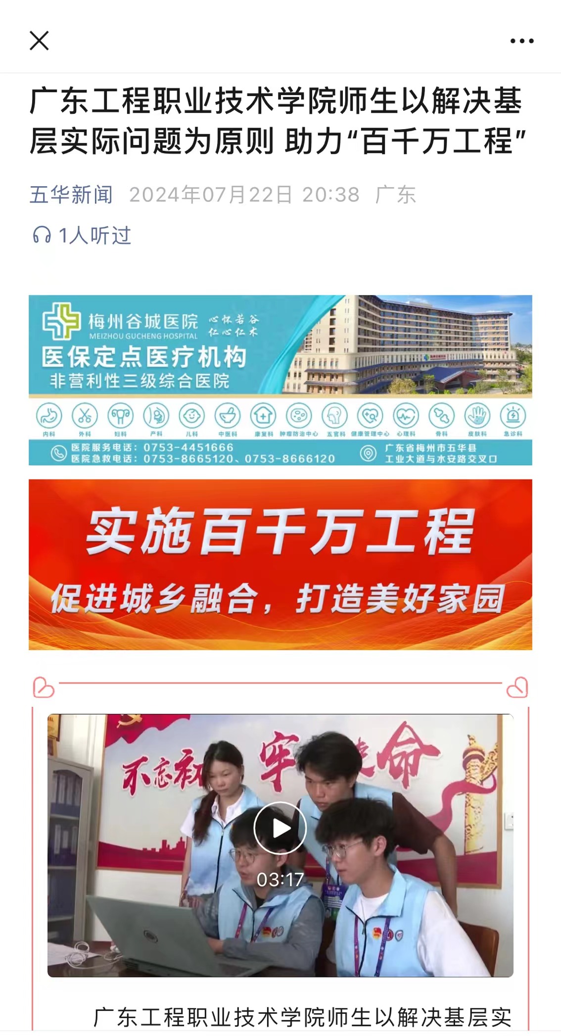 廣東工程職業(yè)技術(shù)學(xué)院師生以解決基層實(shí)際問題為原則,以百縣千鎮(zhèn)萬村高質(zhì)量發(fā)展需求為導(dǎo)向,深入到邊遠(yuǎn)的龍村鎮(zhèn)服務(wù)基層,助力“百千萬工程”。