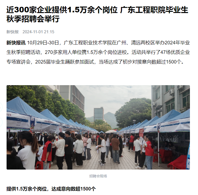新快報訊10月29日-30日,廣東工程職業(yè)技術學院在廣州、清遠兩校區(qū)舉辦2024年畢業(yè)生秋季招聘活動,270多家用人單位攜1.5萬余個崗位進校。活動共舉行了47場優(yōu)質(zhì)企業(yè)專場宣講會,2025屆畢業(yè)生踴躍參加面試,當場達成了初步對接意向數(shù)超過1500個。