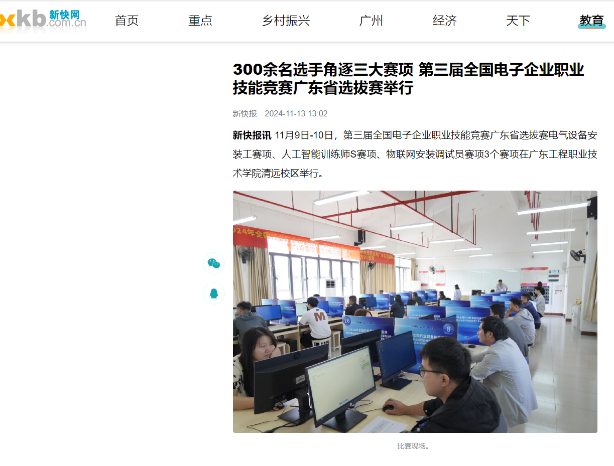 新快報(bào)訊11月9日-10日,第三屆全國電子企業(yè)職業(yè)技能競賽廣東省選拔賽電氣設(shè)備安裝工賽項(xiàng)、人工智能訓(xùn)練師S賽項(xiàng)、物聯(lián)網(wǎng)安裝調(diào)試員賽項(xiàng)3個(gè)賽項(xiàng)在廣東工程職業(yè)技術(shù)學(xué)院清遠(yuǎn)校區(qū)舉行。