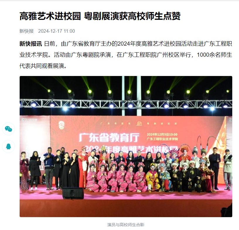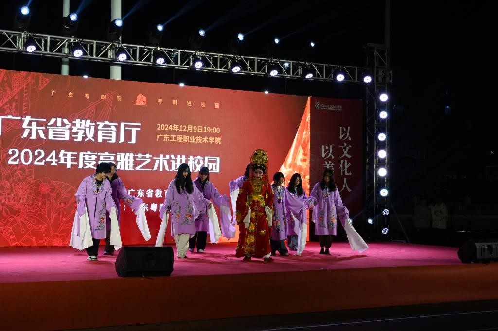 新快報訊日前,由廣東省教育廳主辦的2024年度高雅藝術進校園活動走進廣東工程職業(yè)技術學院。活動由廣東粵劇院承演,在廣東工程職院廣州校區(qū)舉行,1000余名師生代表共同觀看展演。