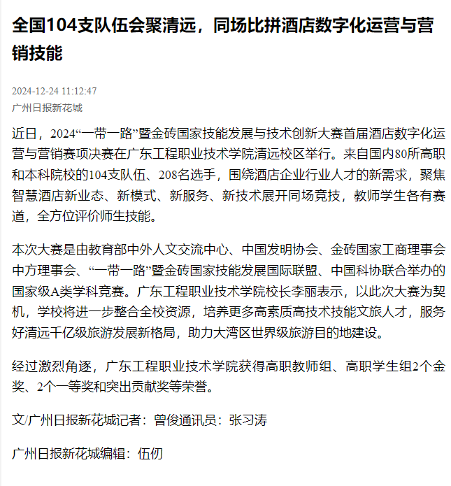 近日,2024“一帶一路”暨金磚國家技能發(fā)展與技術(shù)創(chuàng)新大賽首屆酒店數(shù)字化運(yùn)營與營銷賽項(xiàng)決賽在廣東工程職業(yè)技術(shù)學(xué)院清遠(yuǎn)校區(qū)舉行。來自國內(nèi)80所高職和本科院校的104支隊伍、208名選手,圍繞酒店企業(yè)行業(yè)人才的新需求,聚焦智慧酒店新業(yè)態(tài)、新模式、新服務(wù)、新技術(shù)展開同場競技,教師學(xué)生各有賽道,全方位評價師生技能。