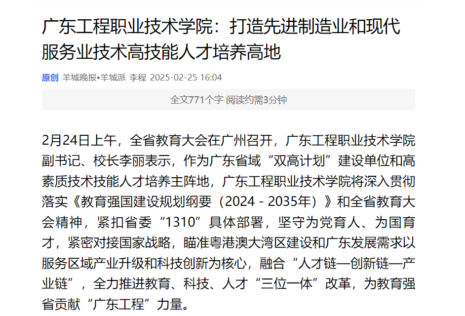 2月24日上午,全省教育大會在廣州召開,廣東工程職業(yè)技術(shù)學(xué)院副書記、校長李麗表示,作為廣東省域“雙高計劃”建設(shè)單位和高素質(zhì)技術(shù)技能人才培養(yǎng)主陣地,廣東工程職業(yè)技術(shù)學(xué)院將深入貫徹落實《教育強國建設(shè)規(guī)劃綱要(2024-2035年)》和全省教育大會精神,緊扣省委“1310”具體部署,堅守為黨育人、為國育才,緊密對接國家戰(zhàn)略,瞄準(zhǔn)粵港澳大灣區(qū)建設(shè)和廣東發(fā)展需求以服務(wù)區(qū)域產(chǎn)業(yè)升級和科技創(chuàng)新為核心,融合“人才鏈—創(chuàng)新鏈—產(chǎn)業(yè)鏈”,全力推進教育、科技、人才“三位一體”改革,為教育強省貢獻“廣東工程”力量。