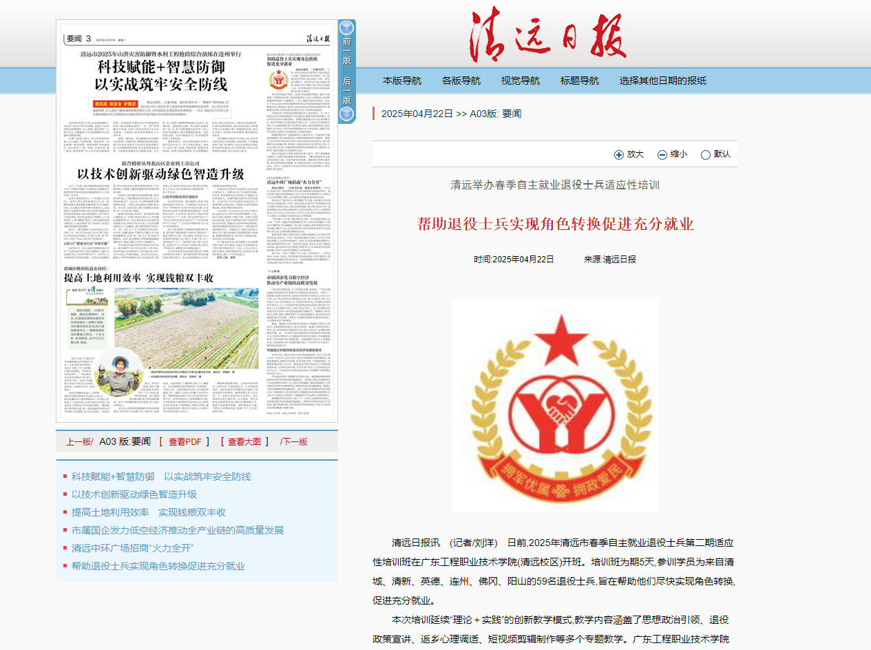清遠日報訊 (記者/劉洋) 日前,2025年清遠市春季自主就業(yè)退役士兵第二期適應(yīng)性培訓(xùn)班在廣東工程職業(yè)技術(shù)學(xué)院(清遠校區(qū))開班。培訓(xùn)班為期5天,參訓(xùn)學(xué)員為來自清城、清新、英德、連州、佛岡、陽山的59名退役士兵,旨在幫助他們盡快實現(xiàn)角色轉(zhuǎn)換,促進充分就業(yè)。