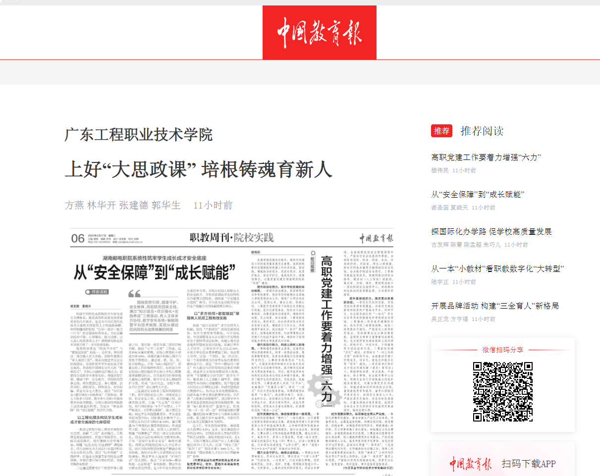 廣東工程職業(yè)技術(shù)學(xué)院聚焦“培養(yǎng)什么人、怎樣培養(yǎng)人、為誰培養(yǎng)人”這一教育的根本問題,持續(xù)深化思政課改革創(chuàng)新,將思政教育深度融入人才培養(yǎng)全過程,不斷推進“大思政課”建設(shè),努力培養(yǎng)擔當民族復(fù)興大任的時代新人。