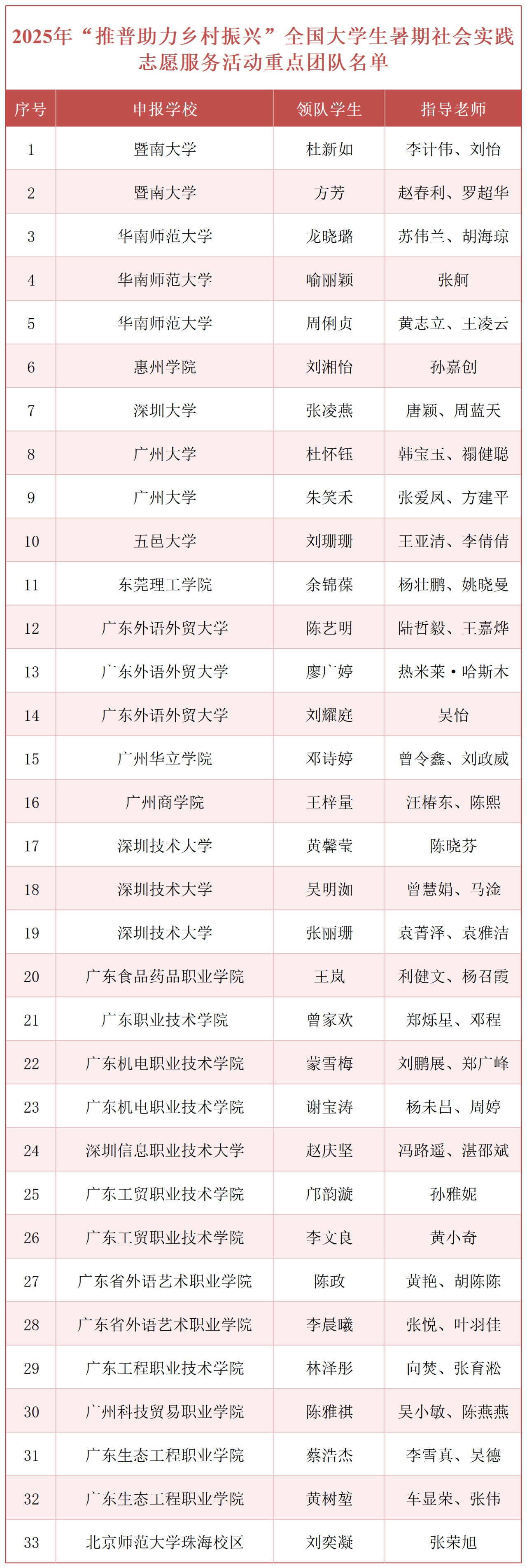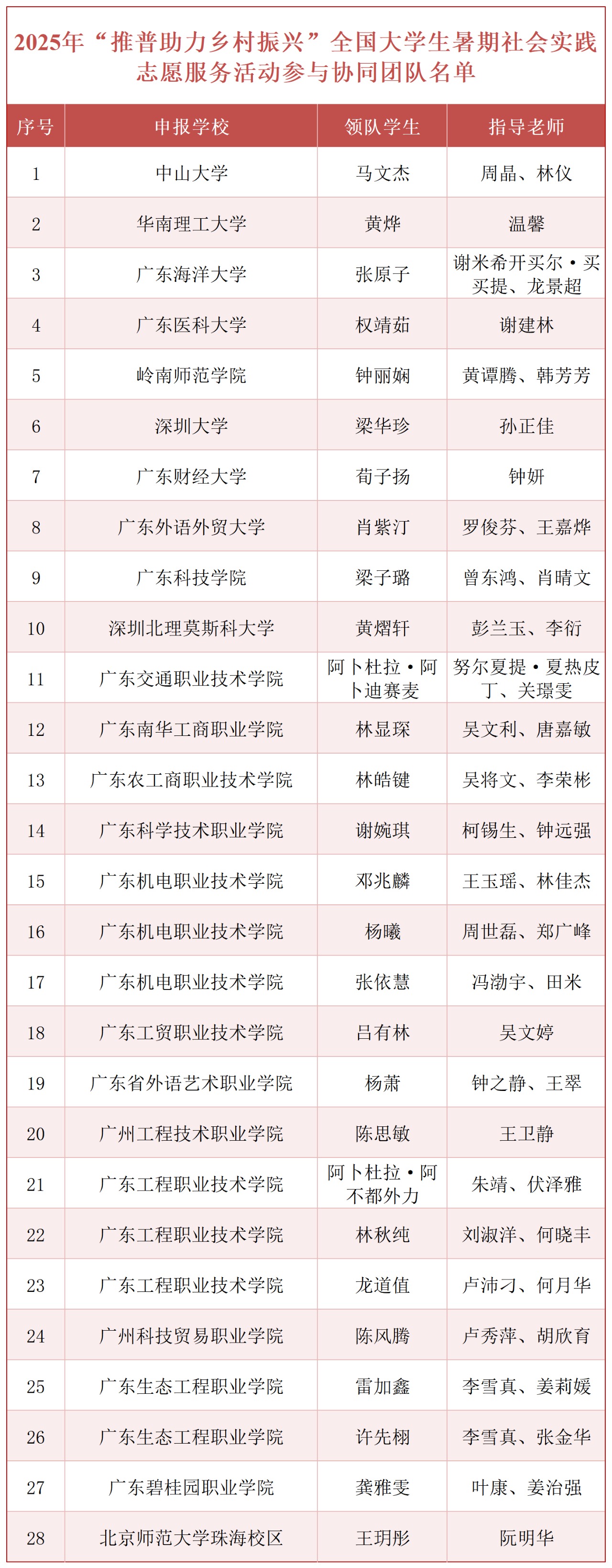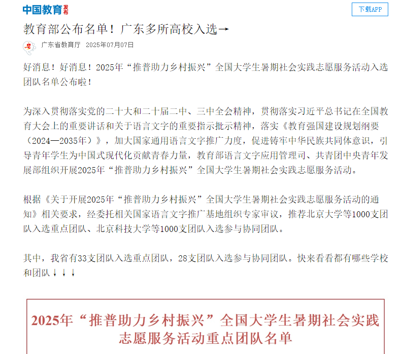 好消息!好消息!2025年“推普助力鄉(xiāng)村振興”全國大學生暑期社會實踐志愿服務活動入選團隊名單公布啦! 為深入貫徹落實黨的二十大和二十屆二中、三中全會精神,貫徹落實習近平總書記在全國教育大會上的重要講話和關(guān)于語言文字的重要指示批示精神,落實《教育強國建設規(guī)劃綱要(2024—2035年)》,加大國家通用語言文字推廣力度,促進鑄牢中華民族共同體意識,引導青年學生為中國式現(xiàn)代化貢獻青春力量,教育部語言文字應用管理司、共青團中央青年發(fā)展部組織開展2025年“推普助力鄉(xiāng)村振興”全國大學生暑期社會實踐志愿服務活動。 根據(jù)《關(guān)于開展2025年“推普助力鄉(xiāng)村振興”全國大學生暑期社會實踐志愿服務活動的通知》相關(guān)要求,經(jīng)委托相關(guān)國家語言文字推廣基地組織專家審議,推薦北京大學等1000支團隊入選重點團隊、北京科技大學等1000支團隊入選參與協(xié)同團隊。