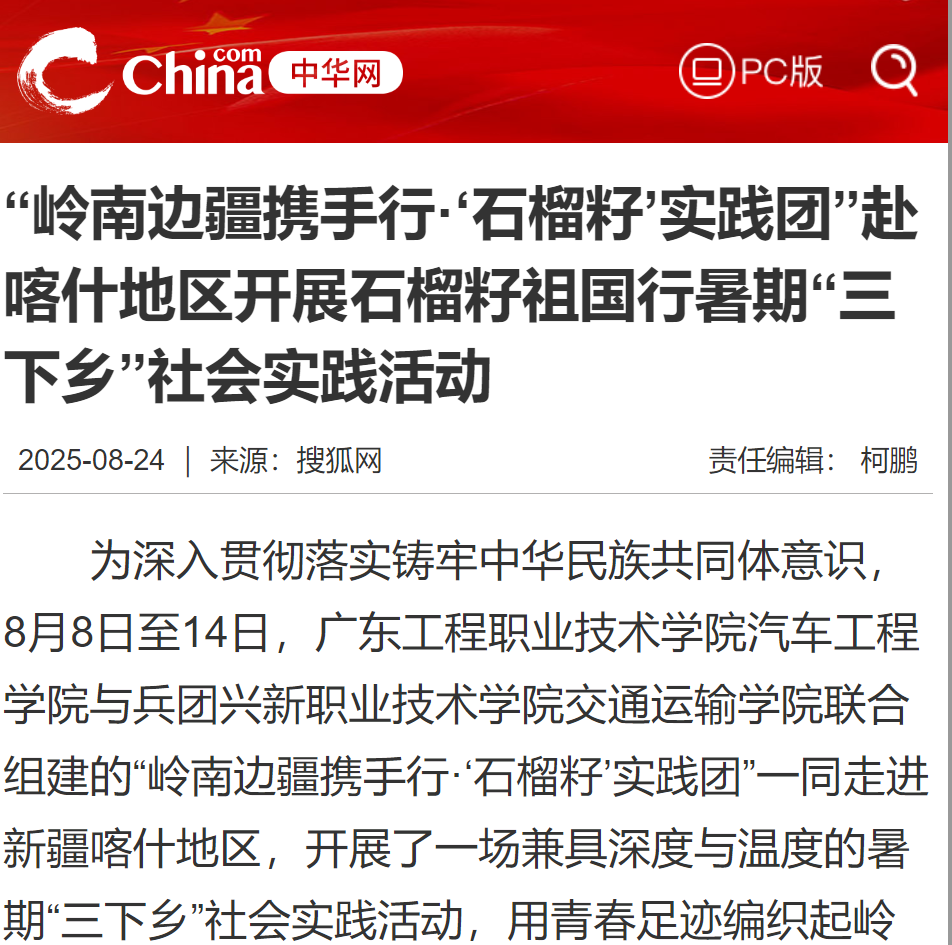 為深入貫徹落實(shí)鑄牢中華民族共同體意識(shí),8月8日至14日,廣東工程職業(yè)技術(shù)學(xué)院汽車工程學(xué)院與兵團(tuán)興新職業(yè)技術(shù)學(xué)院交通運(yùn)輸學(xué)院聯(lián)合組建的“嶺南邊疆?dāng)y手行·‘石榴籽’實(shí)踐團(tuán)”一同走進(jìn)新疆喀什地區(qū),開展了一場(chǎng)兼具深度與溫度的暑期“三下鄉(xiāng)”社會(huì)實(shí)踐活動(dòng),用青春足跡編織起嶺南與邊疆的團(tuán)結(jié)紐帶。