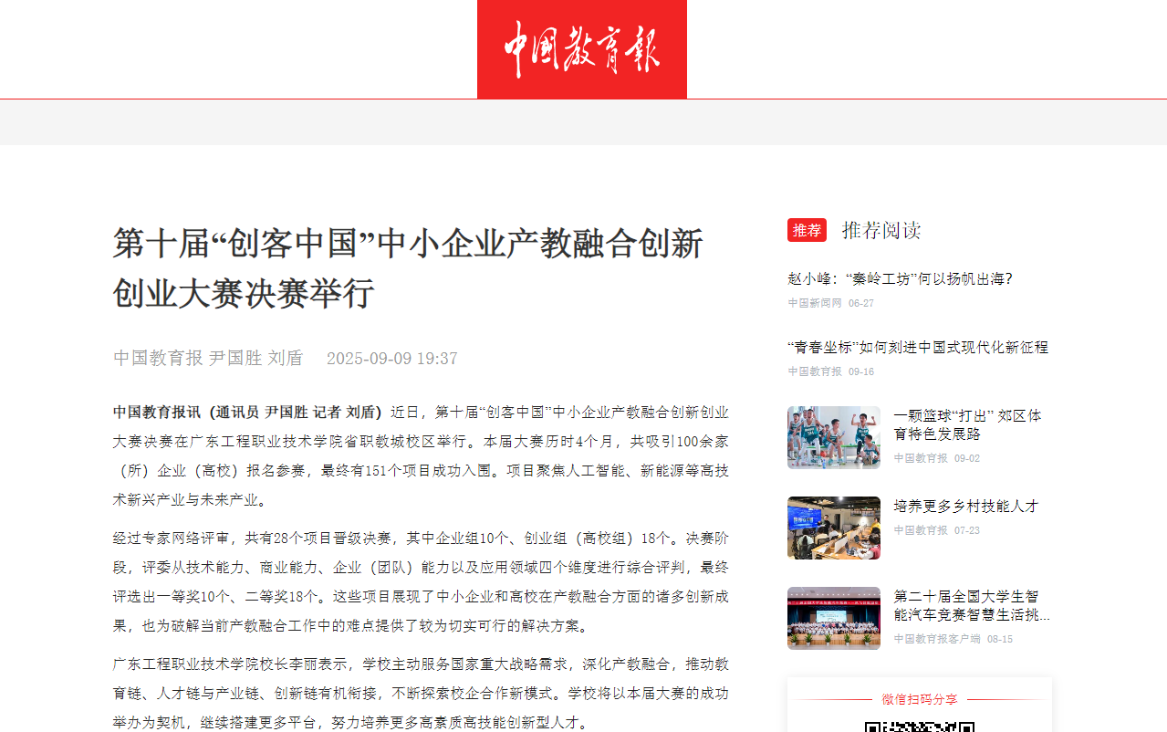 2025年9月9日《中國教育報》刊發(fā)文章《第十屆“創(chuàng)客中國”中小企業(yè)產(chǎn)教融合創(chuàng)新創(chuàng)業(yè)大賽決賽舉行》,報道了我校舉辦第十屆“創(chuàng)客中國”中小企業(yè)產(chǎn)教融合創(chuàng)新創(chuàng)業(yè)大賽決賽。