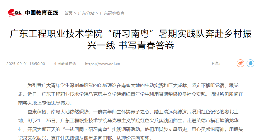 夏末秋初,南粵大地依然熾熱。一群青年師生懷揣赤子之心,踏上清遠(yuǎn)英德這片浸潤(rùn)紅色記憶的粵北土地,8月21—26日,廣東工程職業(yè)技術(shù)學(xué)院馬克思主義學(xué)院紅色尖兵實(shí)踐團(tuán)師生,走進(jìn)英德市橫石塘鎮(zhèn)龍華村,開展為期五天的“一線四同?研習(xí)南粵”實(shí)踐調(diào)研活動(dòng)。他們用腳步丈量歷史,用心靈感悟精神,用鏡頭記錄文化振興,真正讓思政課從課堂走向田野、從理論走向?qū)嵺`。