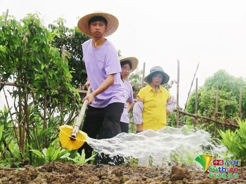 圖為“AI豆智先鋒隊(duì)”團(tuán)隊(duì)成員與農(nóng)戶共同給剛種下的作物潑水。黃嘉豪 供圖