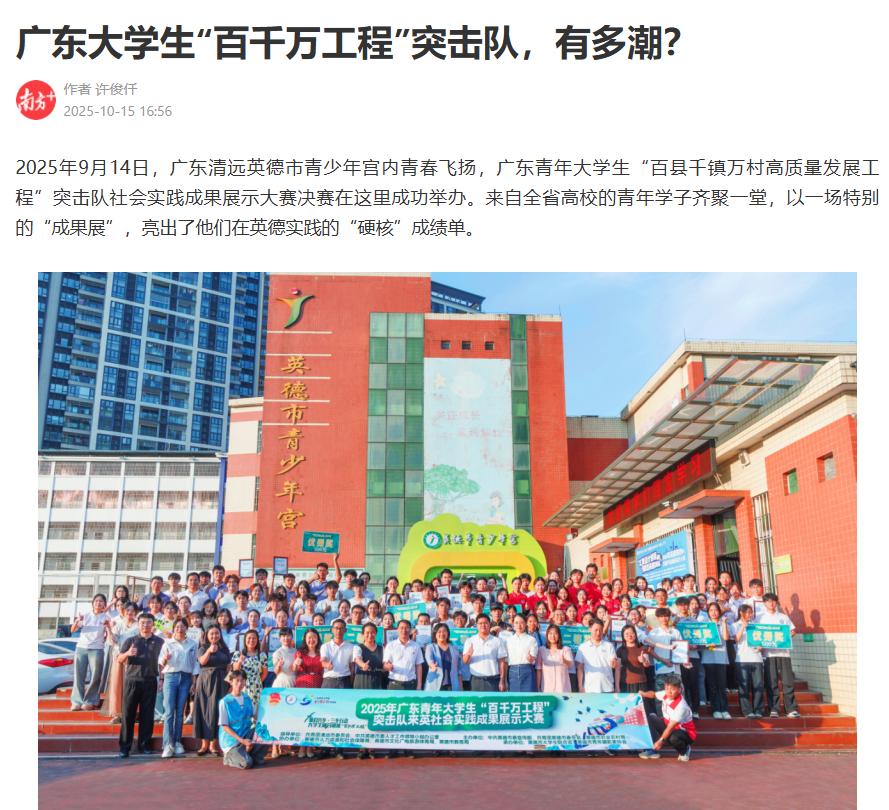 2025年9月14日,廣東清遠(yuǎn)英德市青少年宮內(nèi)青春飛揚(yáng),廣東青年大學(xué)生“百縣千鎮(zhèn)萬(wàn)村高質(zhì)量發(fā)展工程”突擊隊(duì)社會(huì)實(shí)踐成果展示大賽決賽在這里成功舉辦。來(lái)自全省高校的青年學(xué)子齊聚一堂,以一場(chǎng)特別的“成果展”,亮出了他們?cè)谟⒌聦?shí)踐的“硬核”成績(jī)單。