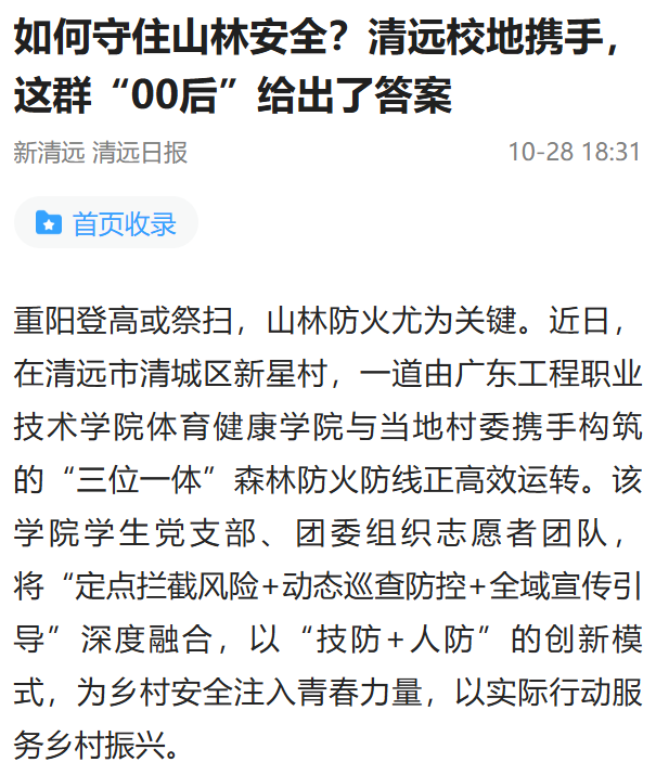重陽(yáng)登高或祭掃,山林防火尤為關(guān)鍵。近日,在清遠(yuǎn)市清城區(qū)新星村,一道由廣東工程職業(yè)技術(shù)學(xué)院體育健康學(xué)院與當(dāng)?shù)卮逦瘮y手構(gòu)筑的“三位一體”森林防火防線正高效運(yùn)轉(zhuǎn)。該學(xué)院學(xué)生黨支部、團(tuán)委組織志愿者團(tuán)隊(duì),將“定點(diǎn)攔截風(fēng)險(xiǎn)+動(dòng)態(tài)巡查防控+全域宣傳引導(dǎo)”深度融合,以“技防+人防”的創(chuàng)新模式,為鄉(xiāng)村安全注入青春力量,以實(shí)際行動(dòng)服務(wù)鄉(xiāng)村振興。