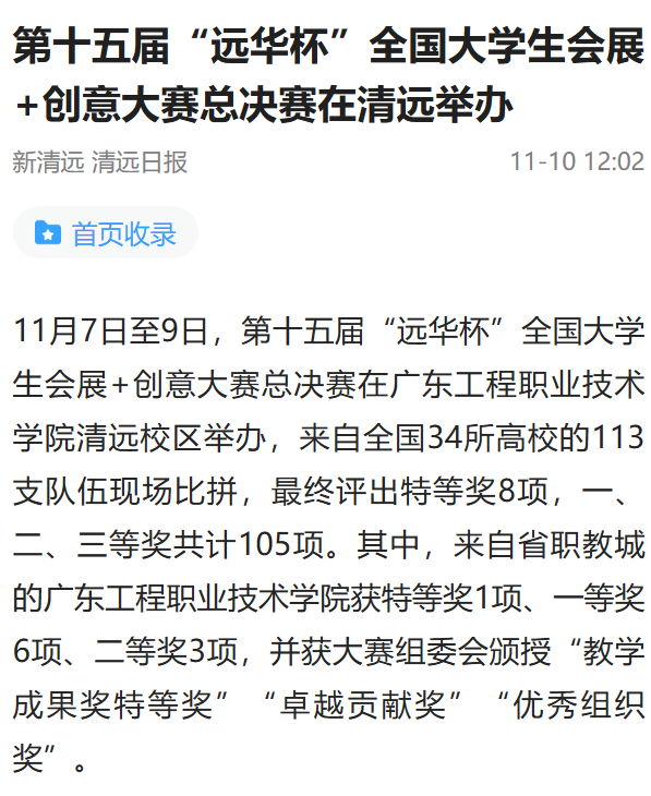 11月7日至9日,第十五屆“遠(yuǎn)華杯”全國(guó)大學(xué)生會(huì)展+創(chuàng)意大賽總決賽在廣東工程職業(yè)技術(shù)學(xué)院清遠(yuǎn)校區(qū)舉辦,來(lái)自全國(guó)34所高校的113支隊(duì)伍現(xiàn)場(chǎng)比拼,最終評(píng)出特等獎(jiǎng)8項(xiàng),一、二、三等獎(jiǎng)共計(jì)105項(xiàng)。其中,來(lái)自省職教城的廣東工程職業(yè)技術(shù)學(xué)院獲特等獎(jiǎng)1項(xiàng)、一等獎(jiǎng)6項(xiàng)、二等獎(jiǎng)3項(xiàng),并獲大賽組委會(huì)頒授“教學(xué)成果獎(jiǎng)特等獎(jiǎng)”“卓越貢獻(xiàn)獎(jiǎng)”“優(yōu)秀組織獎(jiǎng)”。