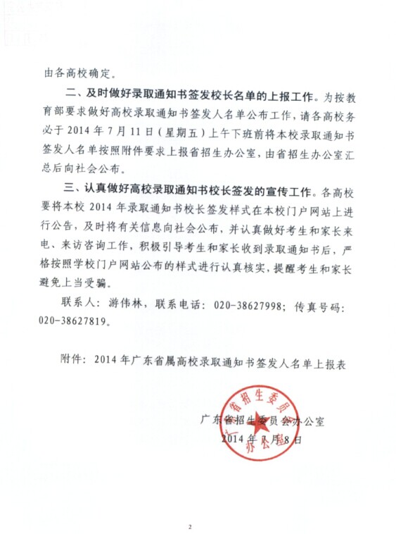 2014年7月8日我校接到廣東省招生委員會緊急通知《關(guān)于做好2014年普通高校錄取通知書校長簽發(fā)工作的通知》(粵招辦普﹝2014)37號文),要求各普通高等學(xué)校認真做好高校錄取通知書校長簽發(fā)工作,并將本校2014年錄取通知書校長簽發(fā)樣式在本校門戶網(wǎng)站上進行公告,積極引導(dǎo)考生及家長收到錄取通知書后,嚴格按照學(xué)校門戶網(wǎng)站公布的樣式進行認真核實,提醒考生和家長避免上當(dāng)受騙。我校嚴格執(zhí)行廣東省招生委員會要求,在所有2014年普高新生錄取通知書上加蓋校長勞漢生簽名章,望考生及家長及時參照比對確認,避免上當(dāng)受騙,特此公告。
