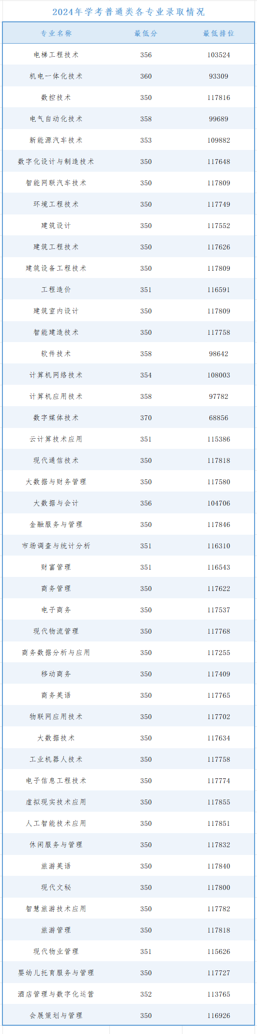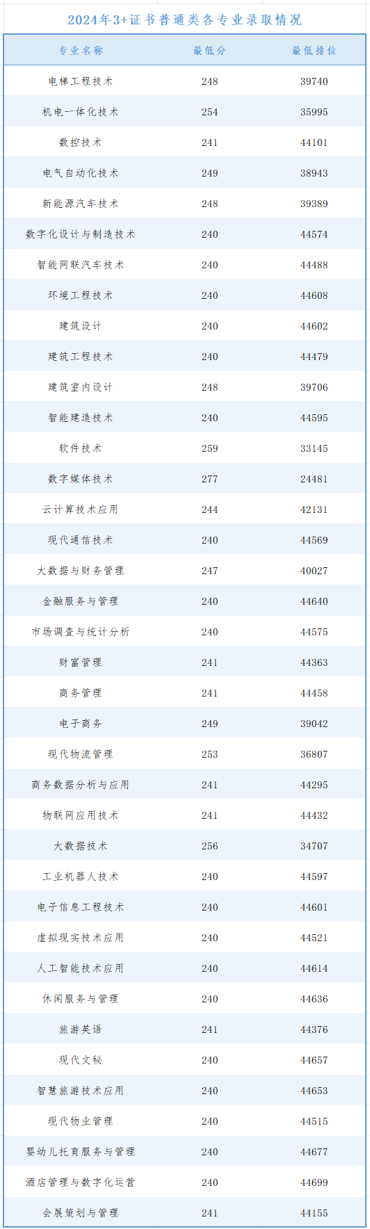 我校2024年春季學(xué)考普通類錄取最低分為350分最低排位為117855,學(xué)考美術(shù)類錄取最低分為251分,最低排位為7512,3+證書普通類錄取最低分為240分,最低排位為44699,3+證書美術(shù)類錄取最低分為242分,最低排位為43689。
